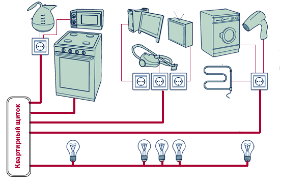 - Обязательно располагайте розетки так, чтобы использовать разные цепи питания на приборы повышенного спроса по мощности.