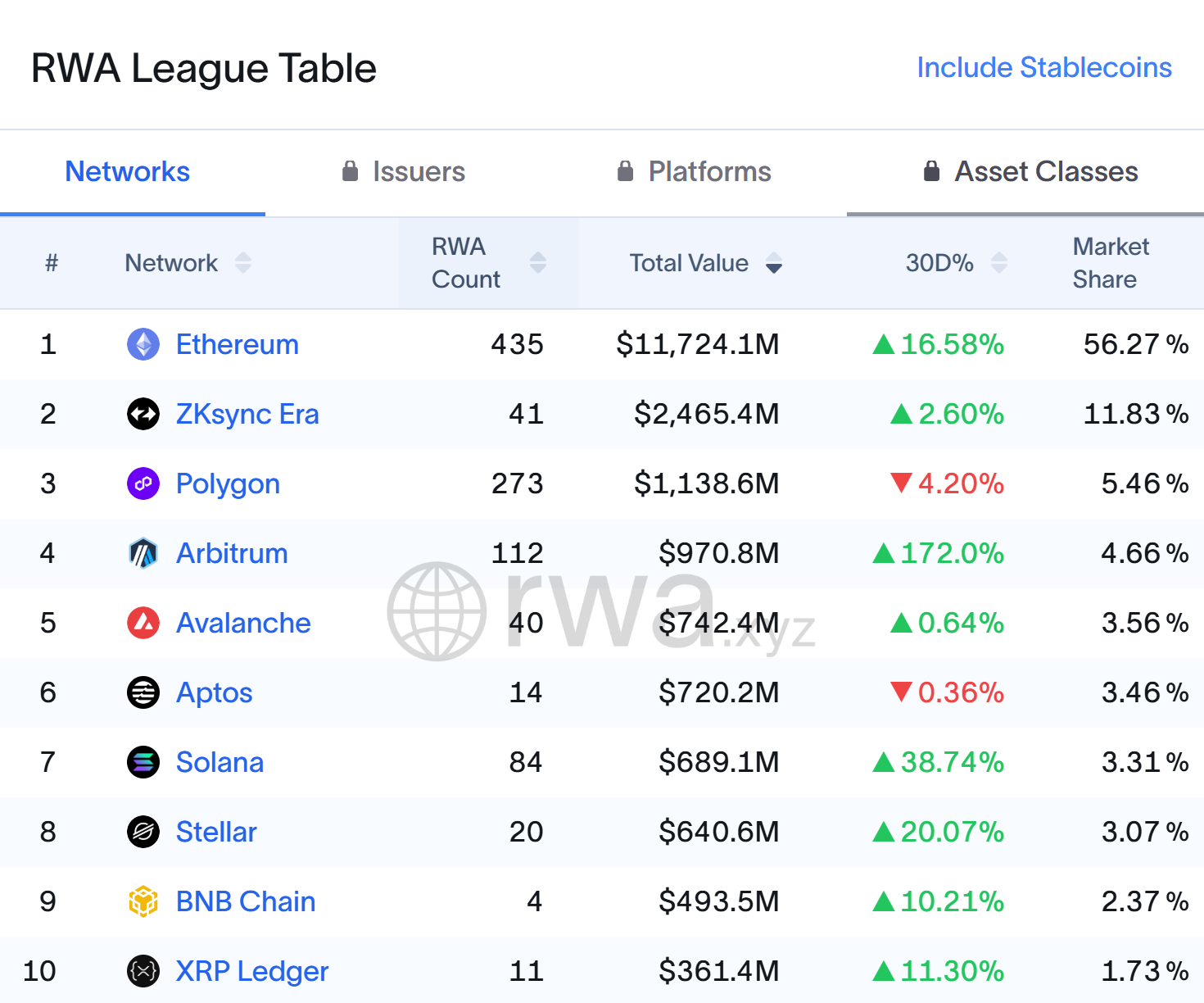 Согласно данным RWA.xyz, Polygon (POL) занимает третье место среди всех блокчейнов по объему токенизации реальных активов (RWA) с общей стоимостью более $1,13 млрд, распределенной по 273 токенизированным активам. Ethereum по-прежнему доминирует с долей рынка 56%.